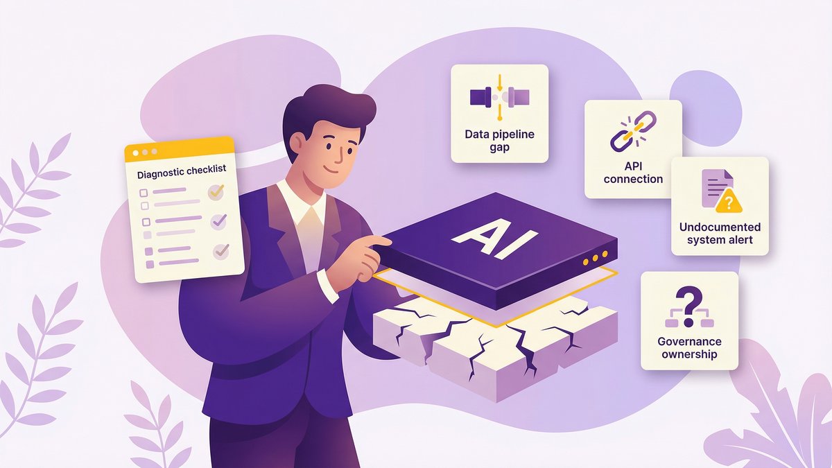 This is why the pre-build diagnostic has to go deeper than the assessment checklist. The checklist asks, “Do you have data pipelines?” The diagnostic asks, “Are those pipelines documented, tested, and owned by someone who’s still here?”